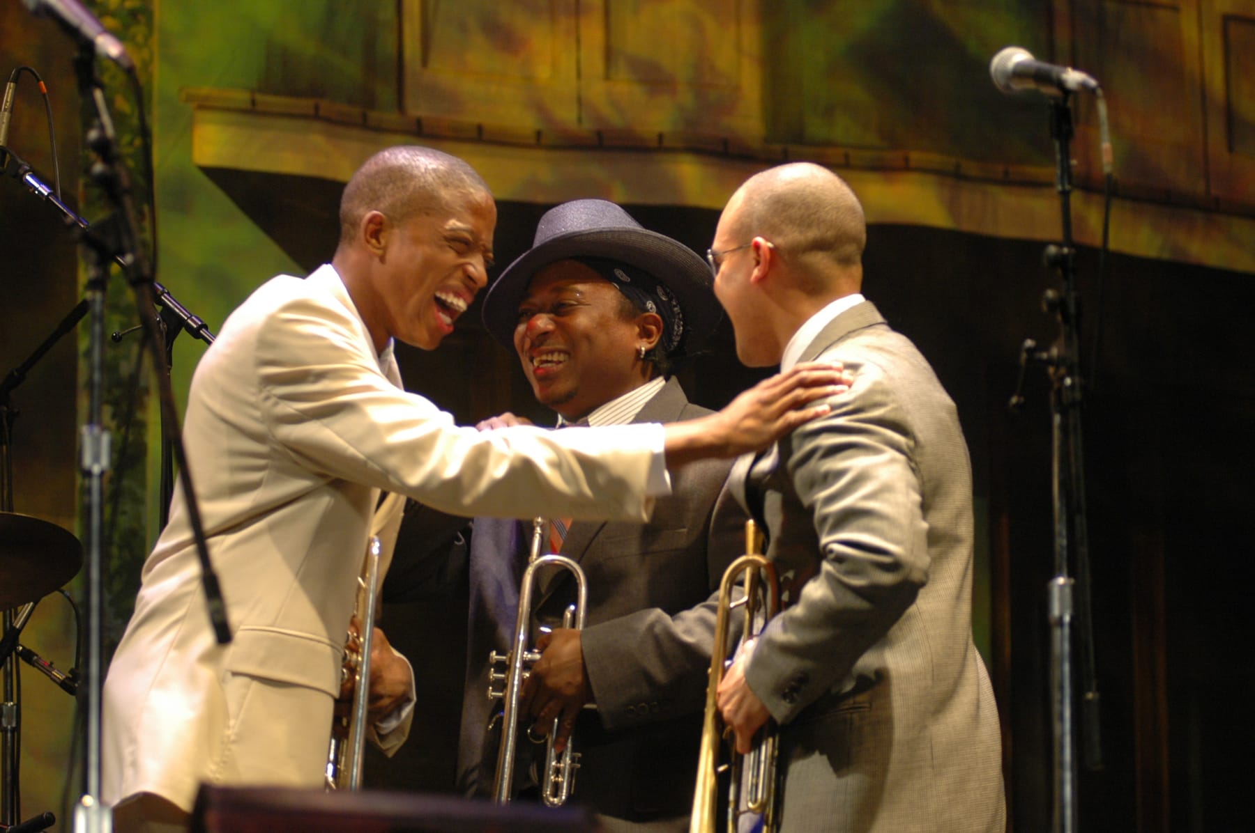 Links: Michael Murphy, der Regisseur von "Make It Funky!" (2004) – Mitte und Rechts: Film Stills aus "Make It Funky!" (2004), Mitte: die Trompeter Troy Andrews, Kermit Ruffins und Irvin Mayfield, Rechts: Mardi Grass, Photo Credit: Michael Murphy Productions.