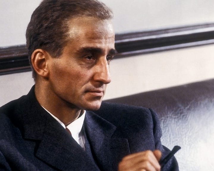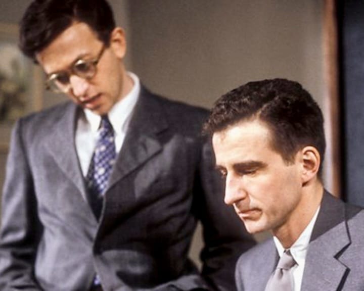 Aber hier kommt sozusagen die "Wasserstoffbestie" in den Auseinandersetzungen hoch. Du magst recht haben mit abgefilmtem Theater. Das haben wir natürlich dann bei In der Sache Robert I. Oppenheimer, bei Kipphardt, über den wir anschließend noch sprechen werden, auch, dass sozusagen als Fernsehspiel eben abgefilmtes Theater war und die filmischen Wurzeln eben aus dem Fernsehtheater her stammen. Aber eine solche Figurenzeichnungen wie Edward Teller durch David Suchet, die fand ich phänomenal, wo ich mich fragte, was ist da der Wesenskern dieser Figur, was die historische Realität angeht?