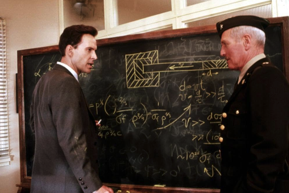 Newman hat wahrscheinlich auch top billing bekommen wegen seinem Namen als zugkräftiger Star. Seine Figur will unbedingt das Projekt durchbringen, sieht seine Verantwortung und will unbedingt den Bau der Atombombe voranbringen, dass man's dann halt auch tatsächlich militärisch einsetzen kann. Und damit nimmt er Dwight Schultz etwas die Möglichkeiten, sagen wir mal, noch mehr exaltiert zu spielen. Ich finde aber, Dwight Schultz ist ein interessanter Schauspieler, weil der macht eben aus relativ wenig doch relativ viel. Er erinnert mich an seine Rollen in Star Trek Next Generation oder Star Trek Voyager.