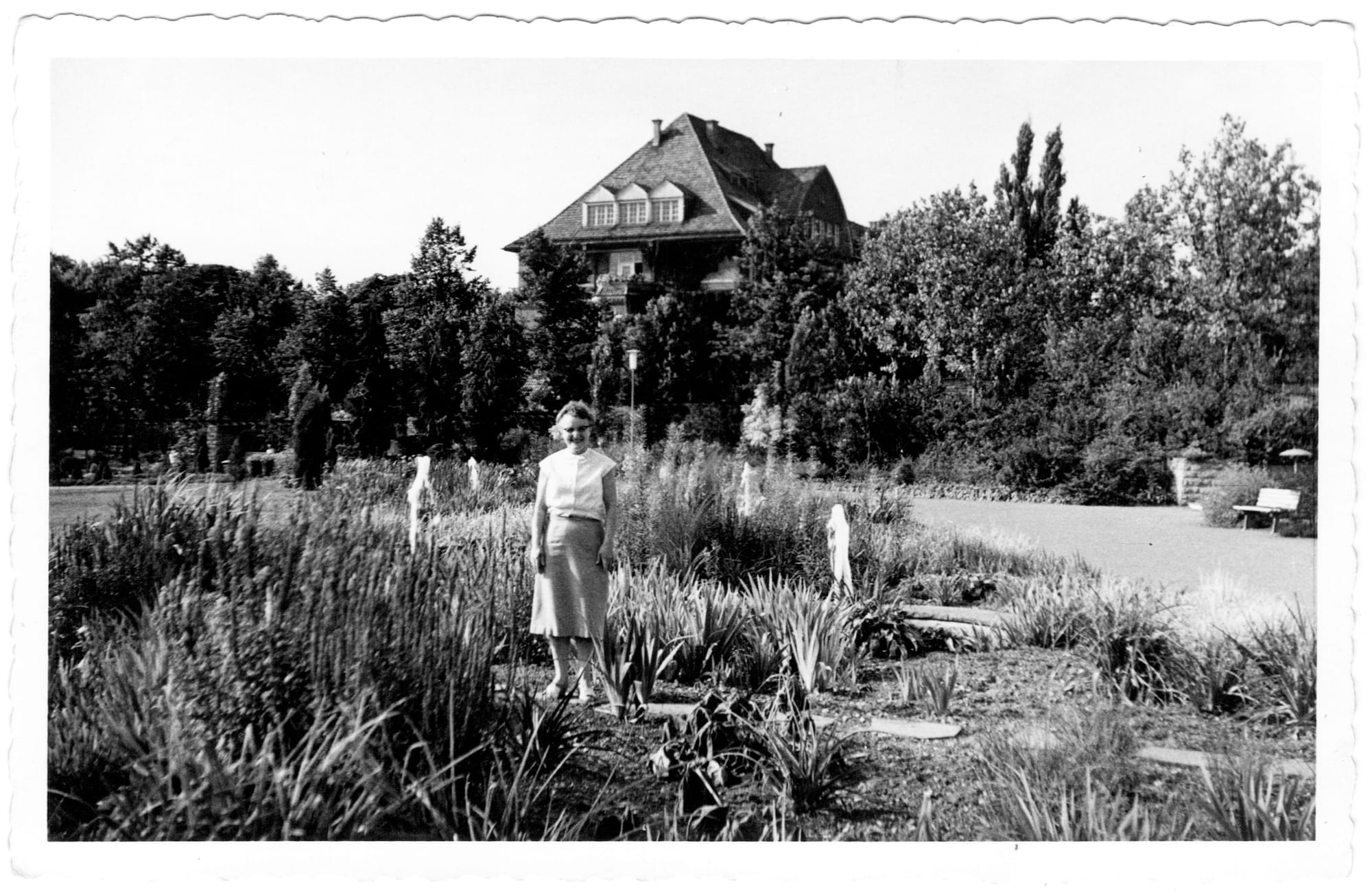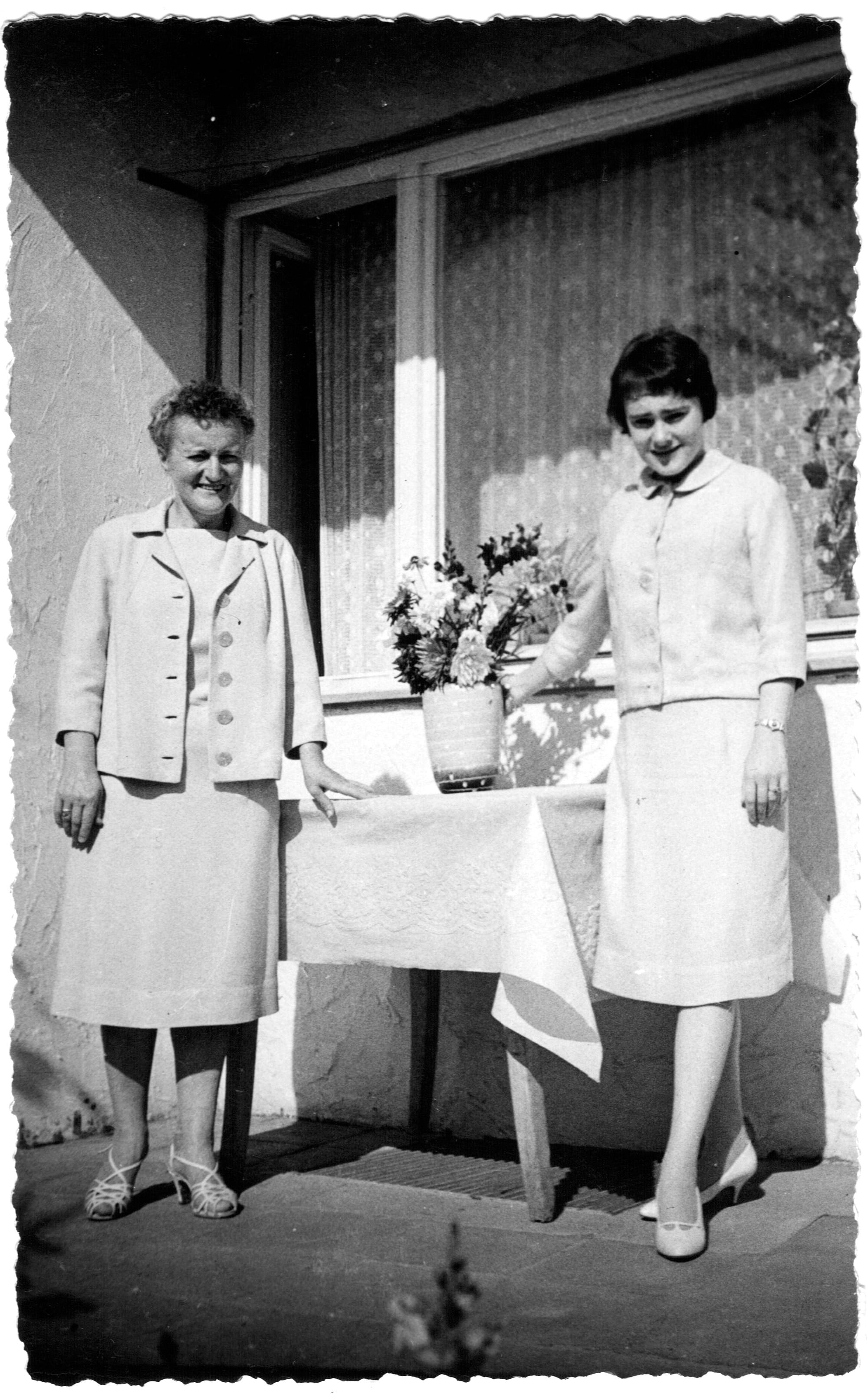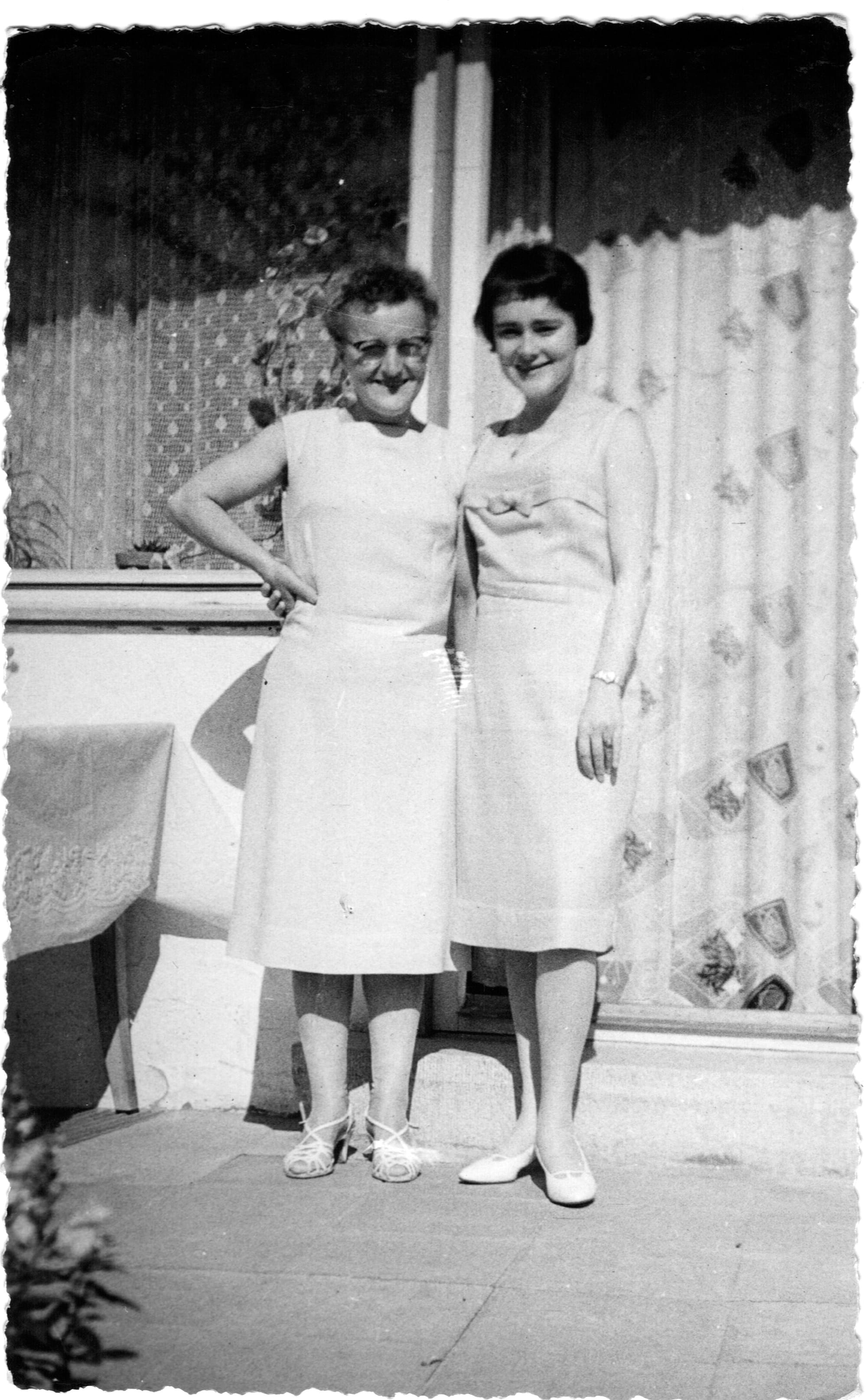 Maria Theresia Hlavatschka, geb. Bobek (jew. links, 1909 - 2005), meine Großmutter, zusammen mit ihrer Tochter und meiner Mutter Herta (*1941), Eislingen an der Fils, Terrasse der Werkswohnung, ca. 1961, Quelle: Familienarchiv Joachim Polzer