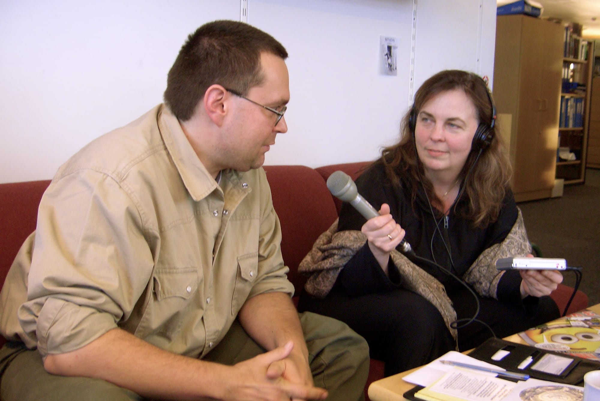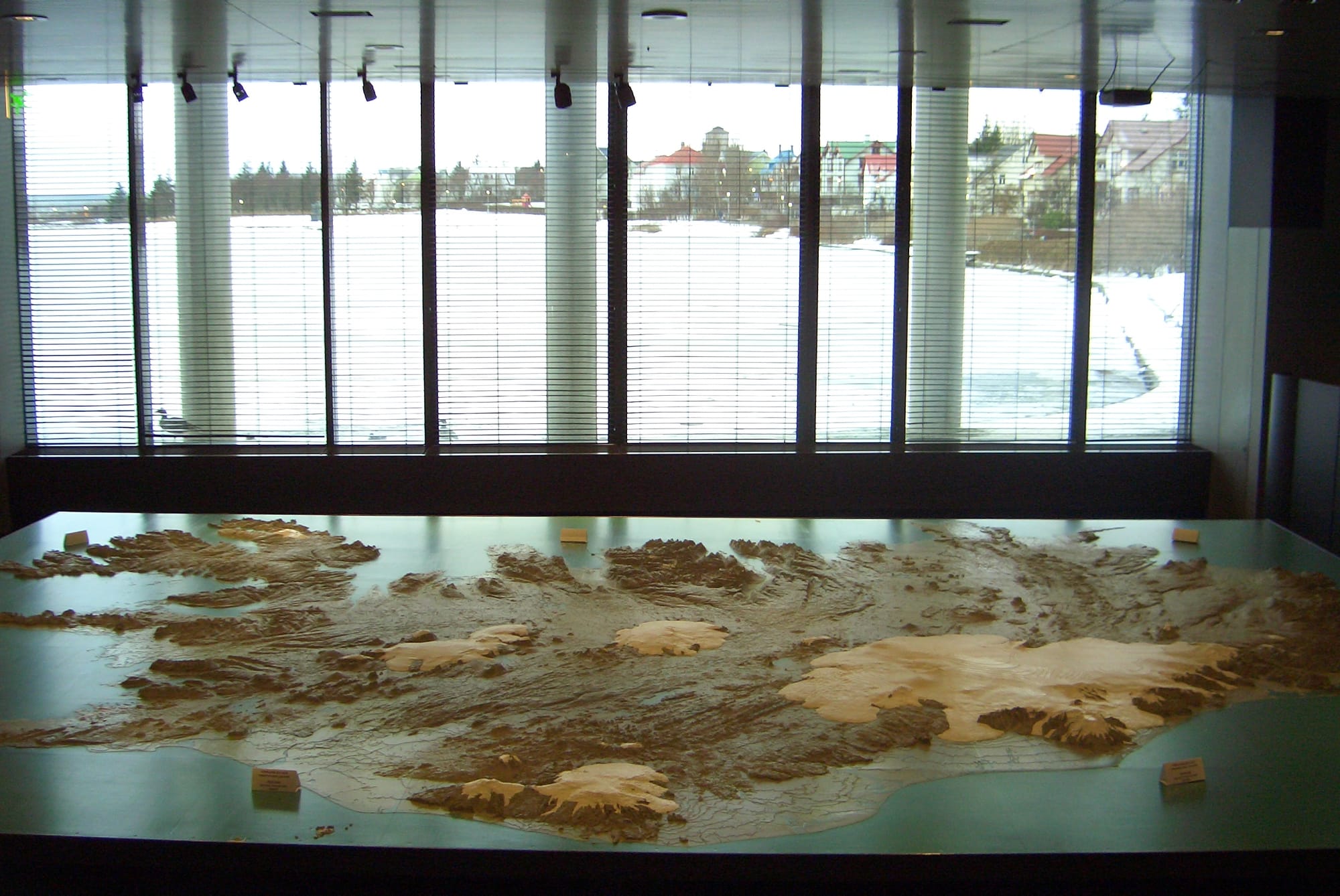 Über den Dächern von Reykjavik: Abstecher zum Public Radio RAS1 im Sendehaus von RÚV Ríkisútvarpið mit einem Bericht aus Flateyri für die RÚV Journalistin Sigridur Petursdottir. – Im Rathaus am Tjörnin-Teich die topographische Relief-Karte des Landes – Fotos: Joachim Polzer, Interview-Foto von Norbert Pintsch | Digital-Fotos