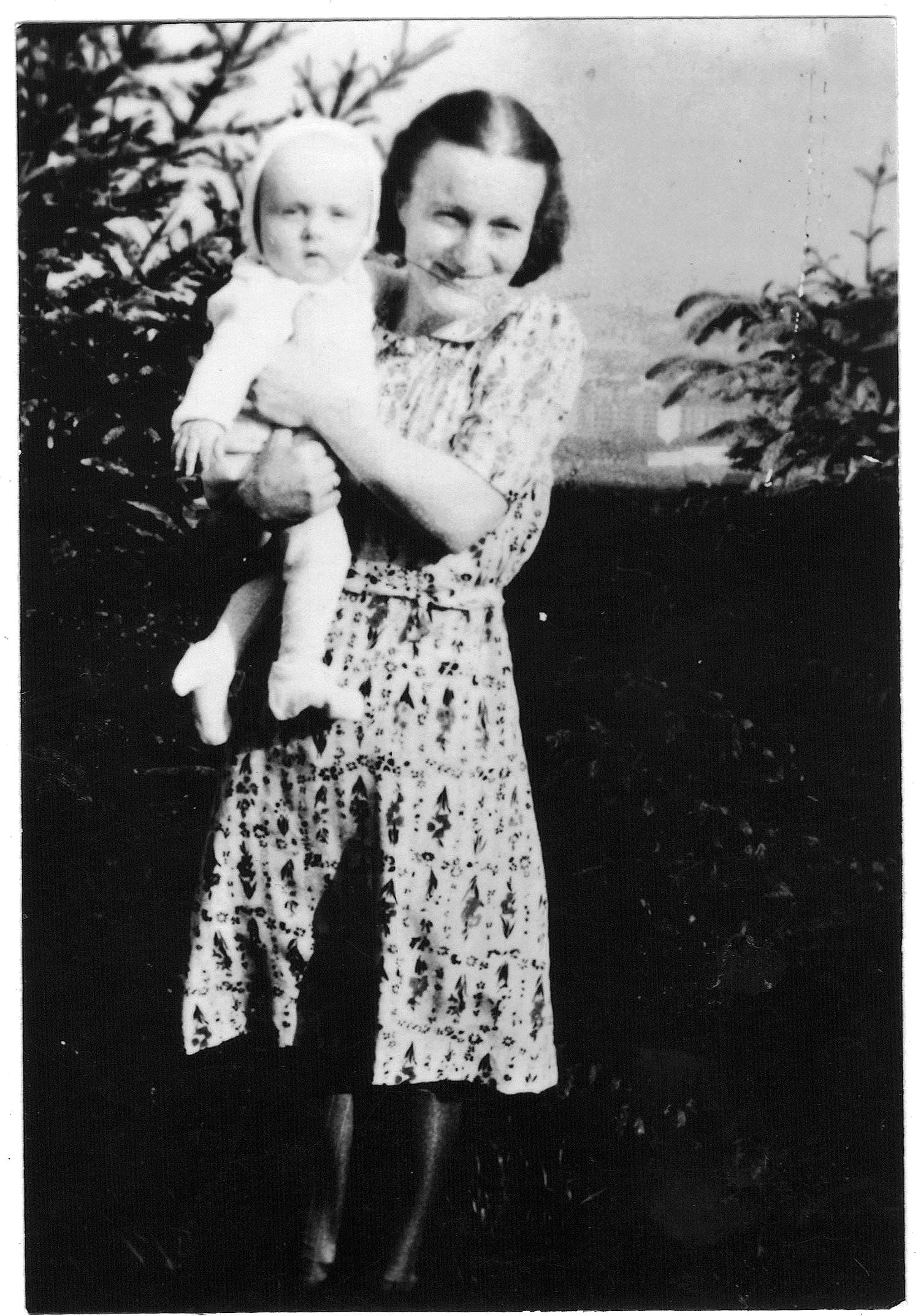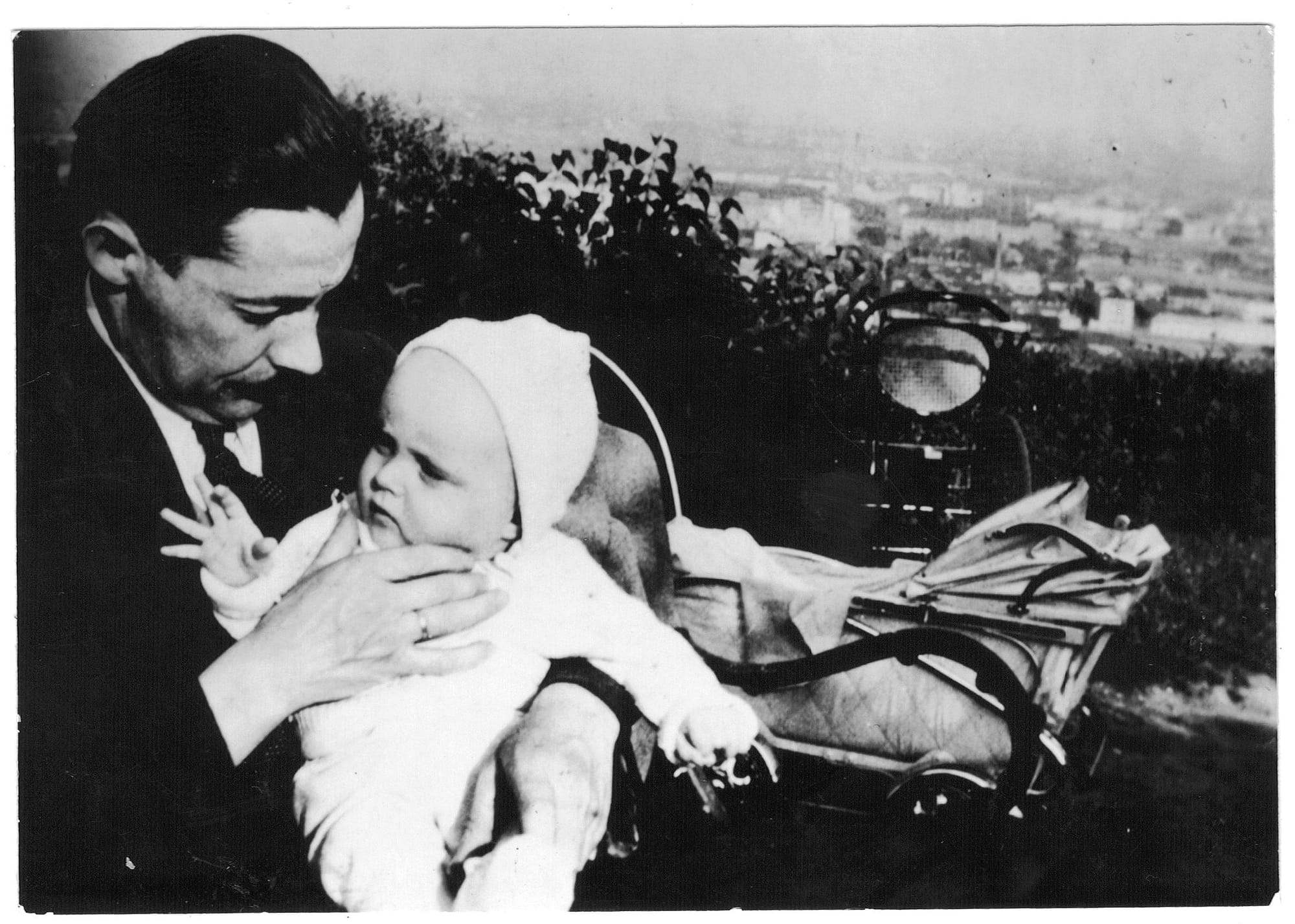 Meine Mutter, Herta Maria Polzer, geborene Hlavaçka, 1942, beim Spaziergang mit Kinderwagen in den Hügeln von Pressburg (aka Bratislava, Slowakien) zusammen mit ihren Eltern: Maria Theresia Hlavaçka, geborene Bobek, und Adolf Hlavaçka. Foto: Familienarchiv Joachim Polzer