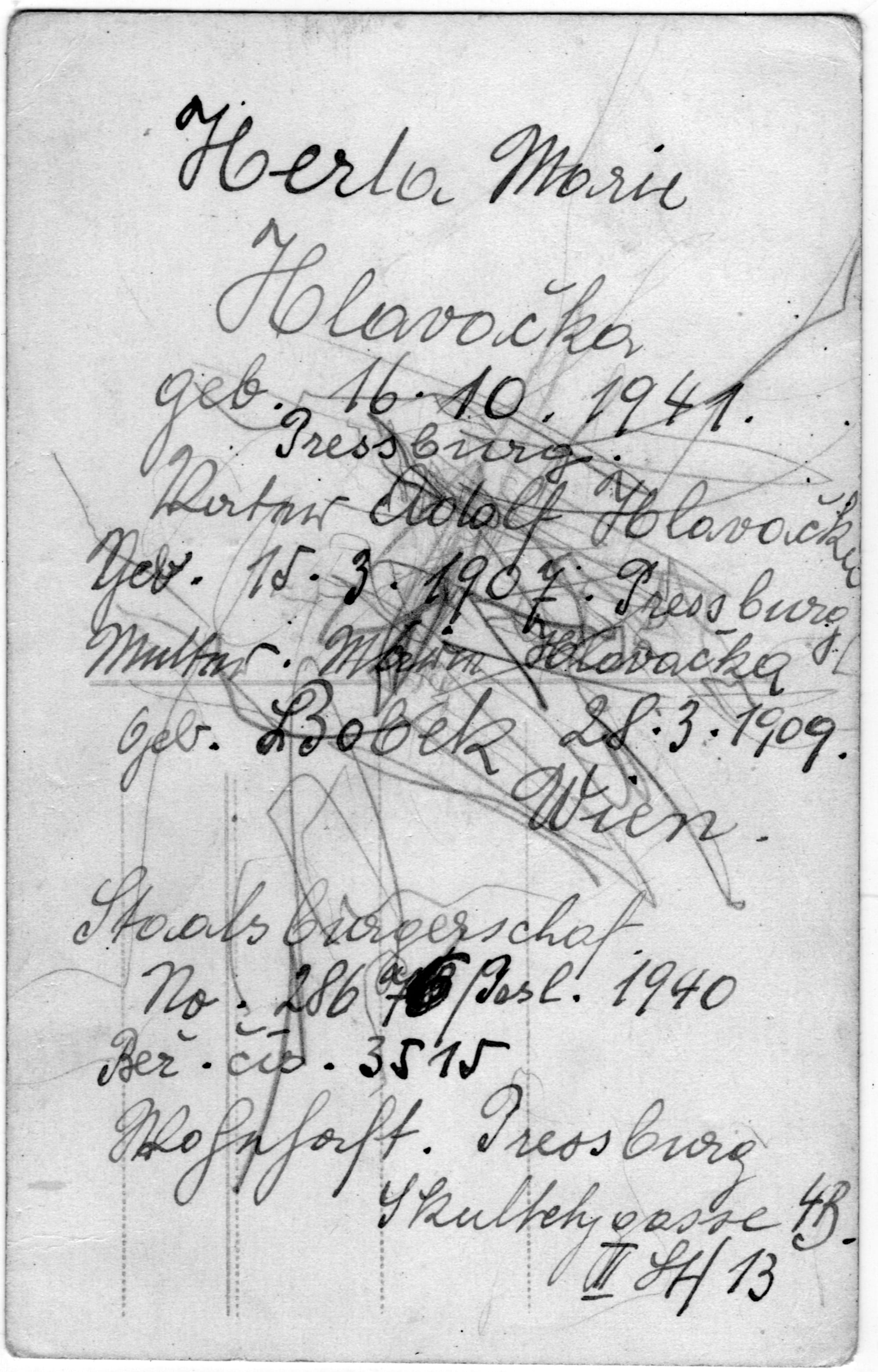 Auf der Rückseite eines Ausschnitt-Fotoabzugs des obigen Porträt-Bildes von Herta aus 1943 finden sich handschriftliche Notizen, vermutlich von meiner Großmutter. Zu Zeiten der deutschen Besatzung waren auch in Pressburg Fragen der Abstammung und der Staatsbürgerschaft essentiell, wie dann auch – unter umgekehrten Vorzeichen – später, zu Zeiten von Besatzung, Verteibung und Flucht aus Pressburg 1945. Quelle: Familienarchiv Joachim Polzer