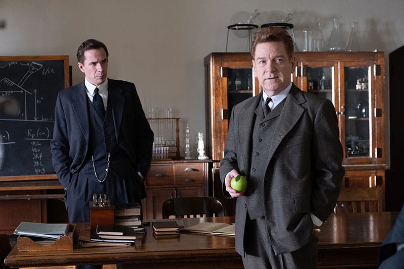 JP> Also Hochachtung. Und zwar auch dafür, dass das ein Drei-Stunden-Film ist und das ist für einen Spielfilm eine ordentliche Ansage, die mit Spannungsbögen füllen zu können. Und er ist vom Figuren-Ensemble so weit gefasst, dass keine wichtige, relevante Person als Figur fehlt und das wirklich bis hinein in die Nebenrollen: Harry Truman mit Gary Oldman – noch nie zuvor hatte ich in einem Spielfilm einen so überzeugenden Harry Truman mit dem passenden, stimmlich stimmigen Akzent gehört wie wie hier. Oder eben, dass einem da plötzlich Albert Einstein begegnet, der da in Princeton spazieren läuft und dabei seine Meinungen und Auffassungen kundtut, neben Niels Bohr, aus Kopenhagen zu Besuch, der von Kenneth Branagh gespielt wird, der meinte, er sei nicht zu Oppenheimer gekommen, um mitzuarbeiten, sondern einfach nur um zu warnen, dass es auch eine Zeit danach geben wird und dass sich Oppenheimer zu kümmern habe über diese Zeit danach. Und dann Werner Heisenberg, wunderbar gespielt von Matthias Schweighöfer, und Figuren wie Vannevar Bush, gespielt von Matthew Modine, eine Wucht, weil Vannevar Bush war eben auch der Vordenker des modernen Computers gewesen, so wie wir ihn dann mit PC und Macintosh kennengelernt haben. Bush hat sozusagen die theoretischen Grundlagen des Computerzeitalters gelegt oder Kurt Gödel, der Mathematiker. Dass Szilárd und Fermi, Rabi, Bethe, Fuchs und Teller als Figuren natürlich auch mit dabei sind, versteht sich von selbst.